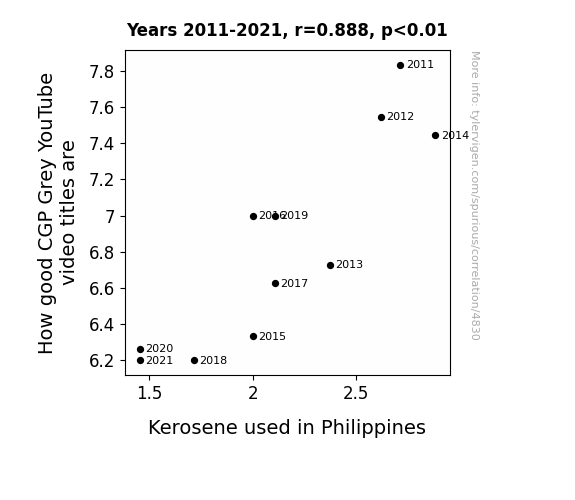 This means 78.9% of the change in the one variable (i.e., Kerosene used in Philippines) is predictable based on the change in the other (i.e., How good CGP Grey YouTube video titles are) over the 11 years from 2011 through 2021.