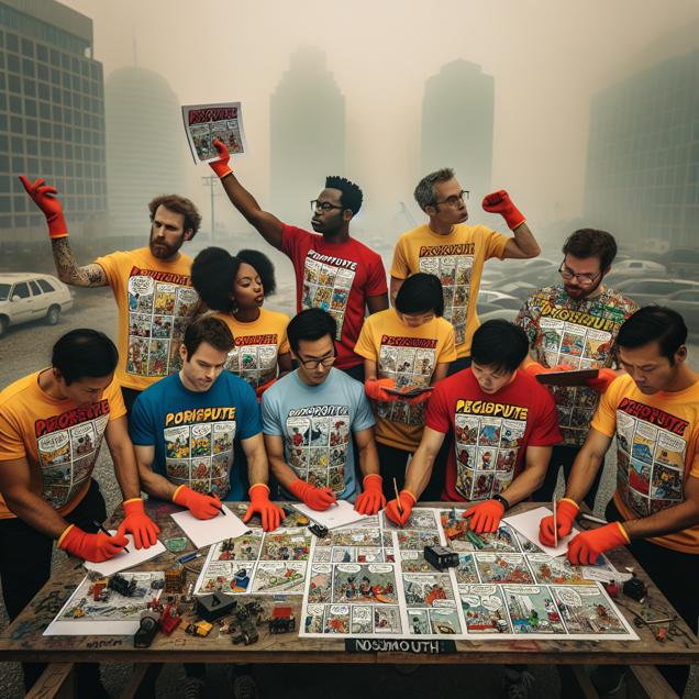 Prompt: [ a Polaroid photo ] of a group of engineers clad in xkcd comic t-shirts huddled around a makeshift table in Portsmouth, Ohio. The heavy smog forms a backdrop as they brainstorm and sketch inventive solutions to combat air pollution. One engineer holds up a comic strip, pointing to a clever idea, while another scribbles furiously on a notepad. Their determination and comic-inspired creativity shine through as they work on developing innovative ways to navigate through the thick smog. The depiction should include only scenes, people, and objects, it should not include text or speech bubbles.