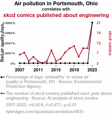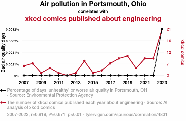 A linear line chart with years as the X-axis and two variables on the Y-axis. The first variable is Air pollution in Portsmouth, Ohio and the second variable is xkcd comics published about engineering.  The chart goes from 2007 to 2023, and the two variables track closely in value over that time. Small Image