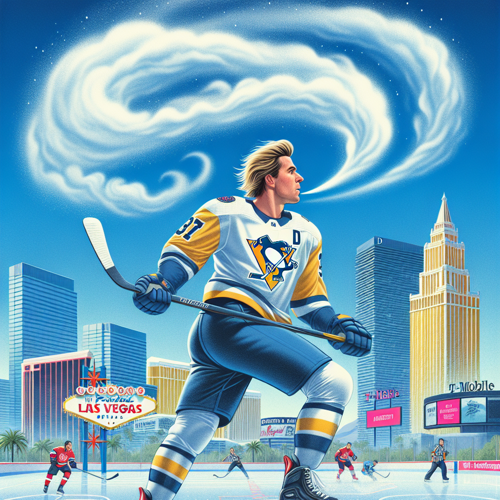 User prompt: Please respond with an image generation prompt that would be likely to create an interesting visual using DALLE-3, using the following style: [ A Discovery magazine cover image ] and depicting this scene: In a clear sky over the Las Vegas Strip, the air quality has visibly improved, with fresh, clean air swirling around the towering buildings. Meanwhile, inside the T-Mobile Arena, Nicklas Backstrom skates energetically across the ice, participating in yet another intense regular season game for the Vegas Golden Knights. Keep the visual depiction simple. Do not include any words or speech bubbles.