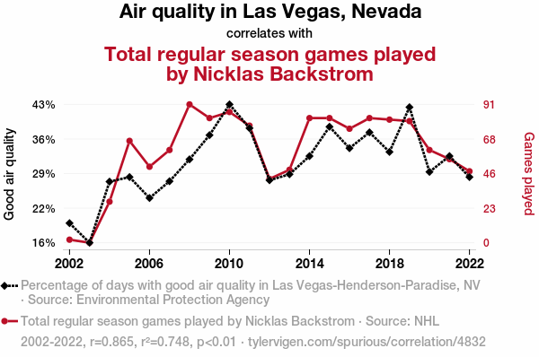 This means 74.8% of the change in the one variable (i.e., Total regular season games played by Nicklas Backstrom) is predictable based on the change in the other (i.e., Air quality in Las Vegas, Nevada) over the 21 years from 2002 through 2022.