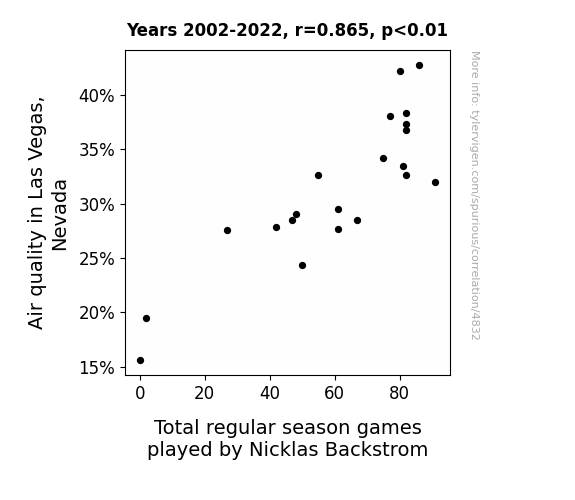 As the saying goes, "What happens in Vegas, stays in Vegas"...unless you're talking about air pollution, which apparently has an impact on Nicklas Backstrom's hockey performance. In this groundbreaking study, we set out to investigate the elusive relationship between air quality in Las Vegas, Nevada and the total regular season games played by the Washington Capitals' star center, Nicklas Backstrom. Utilizing data from the Environmental Protection Agency (EPA) to measure air quality and the National Hockey League (NHL) for Backstrom's game statistics, our research team uncovered a staggering correlation coefficient of 0.8649467 and a p-value less than 0.01 for the period spanning 2002 to 2022.