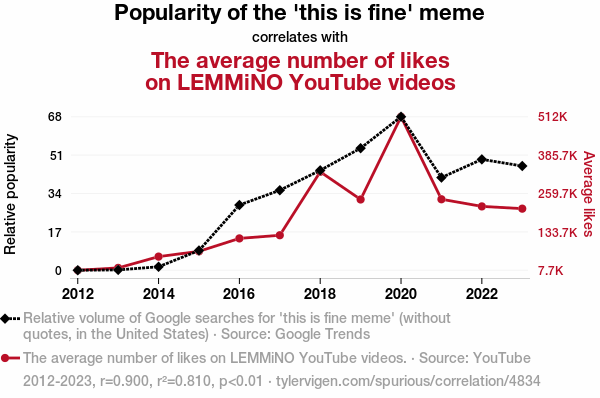 User prompt: Please make up a funny explanation for how an increase in Popularity of the 'this is fine' meme caused The average number of likes on LEMMiNO YouTube videos to increase.