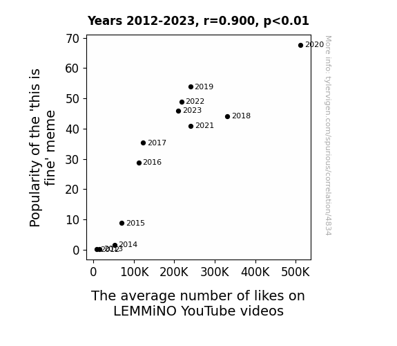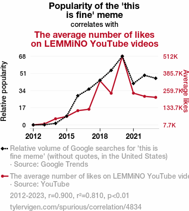This means 81% of the change in the one variable (i.e., The average number of likes on LEMMiNO YouTube videos) is predictable based on the change in the other (i.e., Popularity of the 'this is fine' meme) over the 12 years from 2012 through 2023.