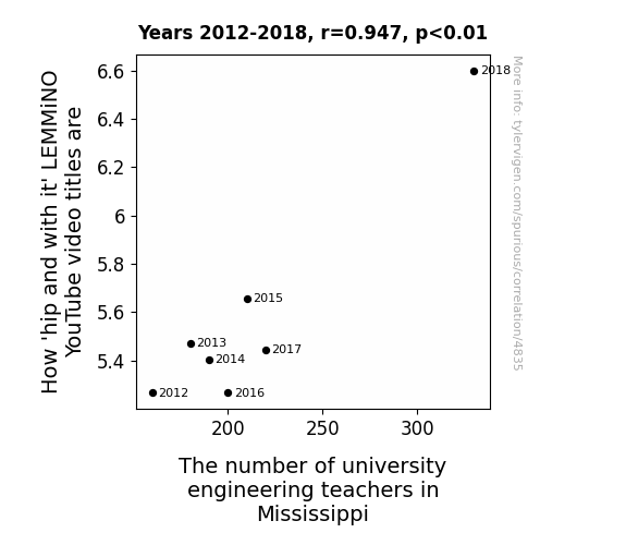 - The spurious research paper: The Connection Between How 'hip and with it' LEMMiNO YouTube Video Titles are and The Number of University Engineering Teachers in Mississippi: A Groovy Analysis