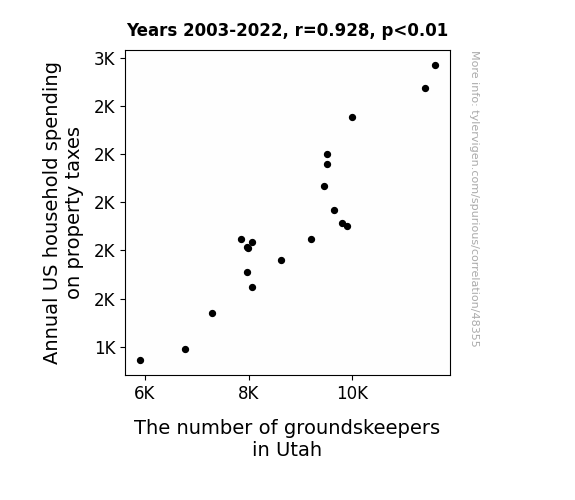 This means 86.1% of the change in the one variable (i.e., The number of groundskeepers in Utah) is predictable based on the change in the other (i.e., Annual US household spending on property taxes) over the 20 years from 2003 through 2022.