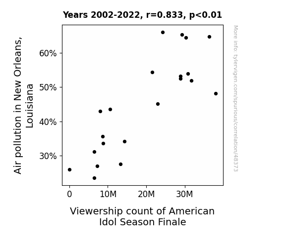 This means 69.4% of the change in the one variable (i.e., Viewership count of American Idol Season Finale) is predictable based on the change in the other (i.e., Air pollution in New Orleans, Louisiana) over the 21 years from 2002 through 2022.