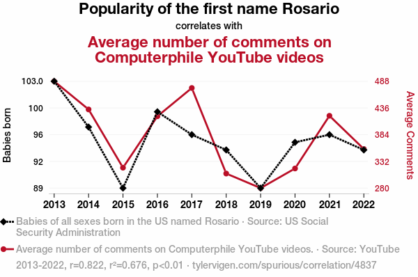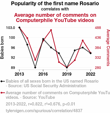 This means 67.6% of the change in the one variable (i.e., Average number of comments on Computerphile YouTube videos) is predictable based on the change in the other (i.e., Popularity of the first name Rosario) over the 10 years from 2013 through 2022.