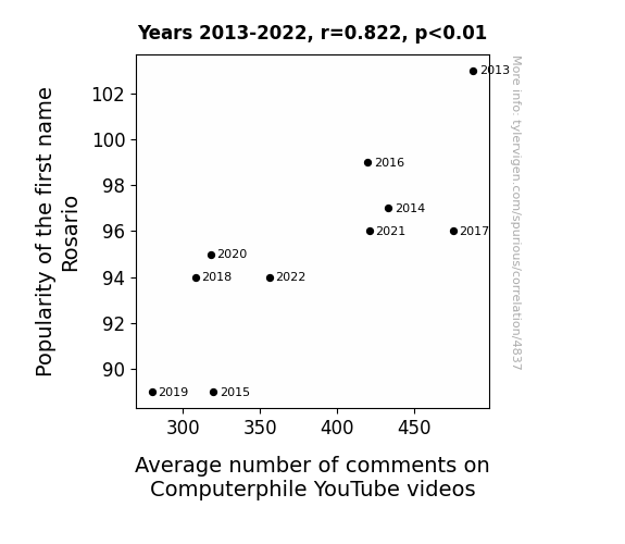 In analyzing the data gathered from the US Social Security Administration and the vast expanse of YouTube, we discovered a striking correlation between the popularity of the first name Rosario and the average number of comments on Computerphile YouTube videos. Our findings unveiled a correlation coefficient of 0.8219120, with an r-squared value of 0.6755393, and a p-value less than 0.01.
