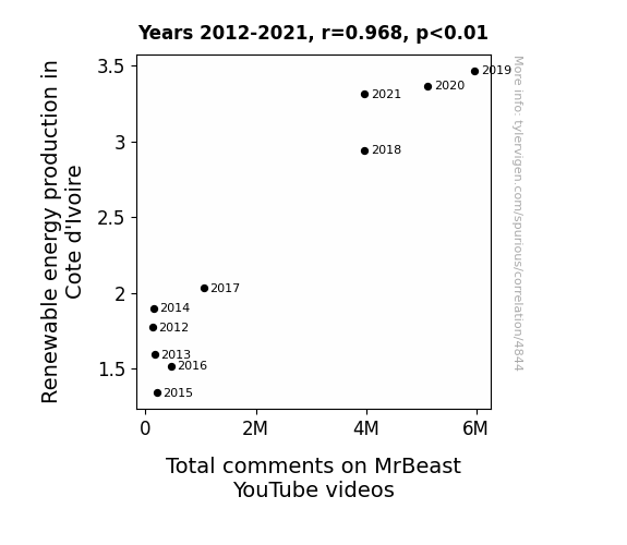 User prompt: Please provide potential search keywords for a paper titled Shocking Connections: Renewable Energy Production in Cote d'Ivoire and Total Comments on MrBeast YouTube Videos with an abstract of In this research paper, we delve into the seemingly unrelated worlds of renewable energy production in Cote d'Ivoire and the total comments on MrBeast YouTube videos. Our team utilized data from the Energy Information Administration and YouTube to explore this curious connection. Through rigorous analysis, we discovered a striking correlation coefficient of 0.9679659 and a statistically significant p-value of less than 0.01 for the years 2012 to 2021.