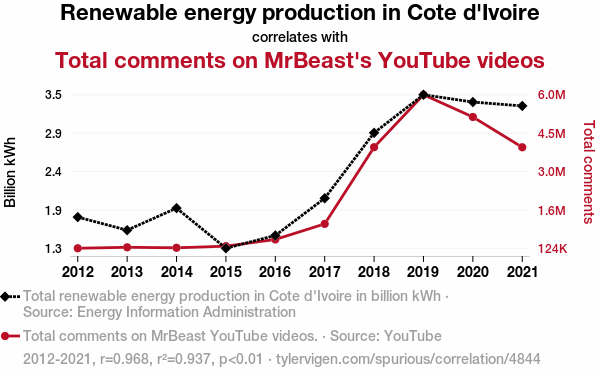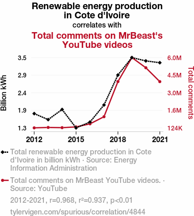 - The spurious research paper: Shocking Connections: Renewable Energy Production in Cote d'Ivoire and Total Comments on MrBeast YouTube Videos