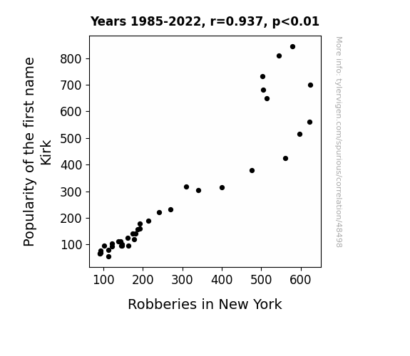 This means 87.7% of the change in the one variable (i.e., Robberies in New York) is predictable based on the change in the other (i.e., Popularity of the first name Kirk) over the 38 years from 1985 through 2022.
