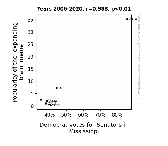 User prompt: Please provide potential search keywords for a paper titled Mirthful Memes and Mississippi's Senatorial Selections: A Playful Probing of the Expanding Brain Phenomenon with an abstract of In this amusing academic exploration, we delve into the delightful world of internet memes and political preference in the context of Mississippi's senatorial elections. Utilizing data from Google Trends and MIT Election Data and Science Lab, Harvard Dataverse, we cunningly set out to investigate the potential linkage between the popularity of the 'expanding brain' meme and the voting patterns for Democratic senators in Mississippi. Our findings, despite being both punderful and surprising, reveal a striking correlation coefficient of 0.9881482 and p < 0.01 for the timeframe spanning 2006 to 2020.