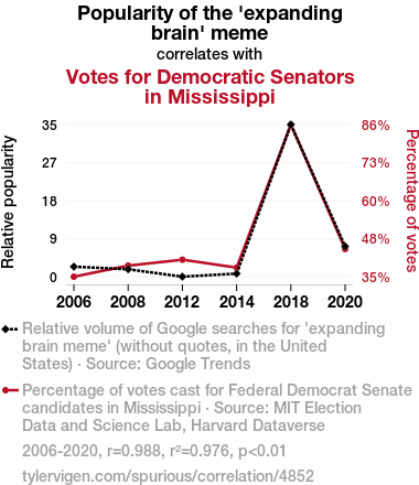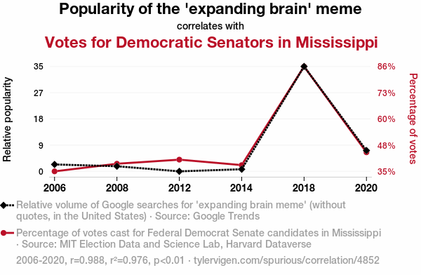 User prompt: Please provide potential search keywords for a paper titled Mirthful Memes and Mississippi's Senatorial Selections: A Playful Probing of the Expanding Brain Phenomenon with an abstract of In this amusing academic exploration, we delve into the delightful world of internet memes and political preference in the context of Mississippi's senatorial elections. Utilizing data from Google Trends and MIT Election Data and Science Lab, Harvard Dataverse, we cunningly set out to investigate the potential linkage between the popularity of the 'expanding brain' meme and the voting patterns for Democratic senators in Mississippi. Our findings, despite being both punderful and surprising, reveal a striking correlation coefficient of 0.9881482 and p < 0.01 for the timeframe spanning 2006 to 2020.