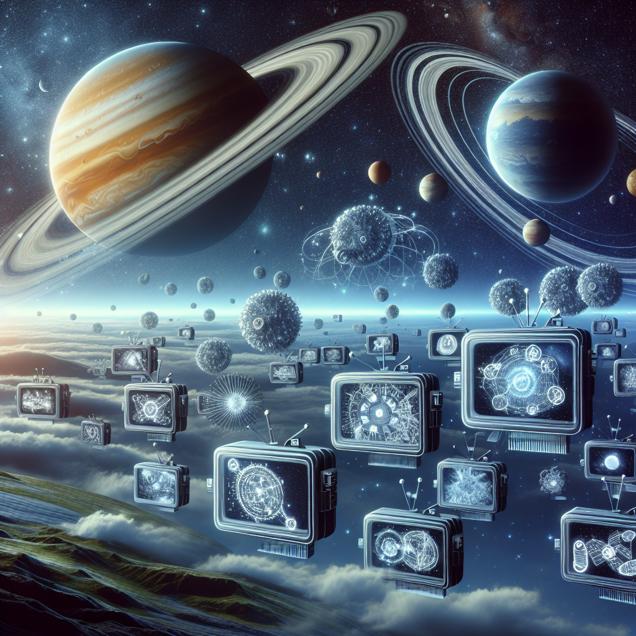 Prompt: Generate an image of a cosmic landscape featuring Neptune and Uranus orbiting far apart in the background. In the foreground, depict a series of SmarterEveryDay YouTube videos stretching out, each showcasing captivating explanations and detailed scientific illustrations as they flow along the gravitational ripple. The videos should appear to extend and dive deeper into their storytelling, within the vastness of space, adding a sense of wonder and curiosity to the scene. The depiction should include only scenes, people, and objects, it should not include text or speech bubbles.
