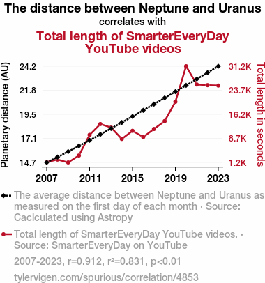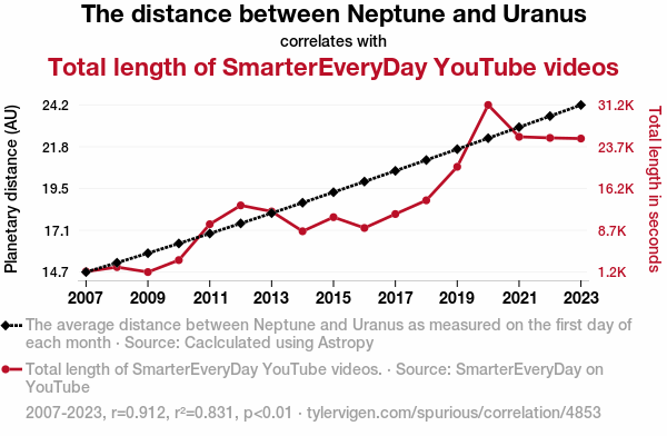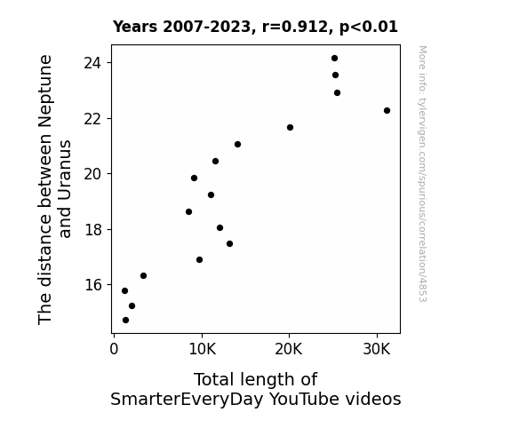 This means 83.1% of the change in the one variable (i.e., Total length of SmarterEveryDay YouTube videos) is predictable based on the change in the other (i.e., The distance between Neptune and Uranus) over the 17 years from 2007 through 2023.