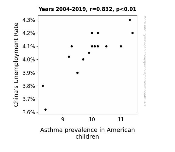 This means 69.3% of the change in the one variable (i.e., Asthma prevalence in American children) is predictable based on the change in the other (i.e., China's Unemployment Rate) over the 16 years from 2004 through 2019.