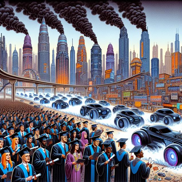 ChatGPT: Generate an image of a futuristic city with tall buildings and a bustling urban environment. In the foreground, depict a group of graduates dressed in caps and gowns, proudly holding their diplomas in Transportation and materials moving. The graduates are revving up big, futuristic vehicles that emit a dark, ominous smog trail as they drive through the city streets of Minneapolis. The smog creates a stark contrast against the bright lights of the city, highlighting the impact of air pollution caused by transportation and materials moving activities.