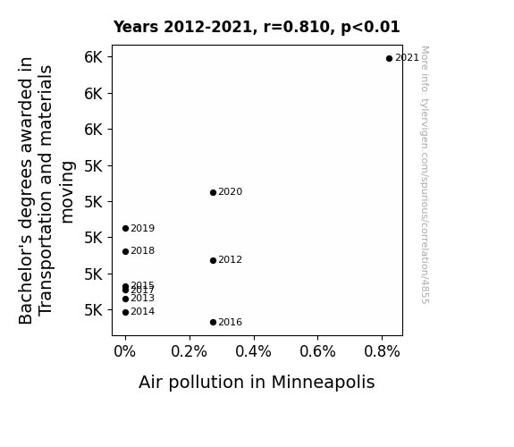 This means 65.6% of the change in the one variable (i.e., Air pollution in Minneapolis) is predictable based on the change in the other (i.e., Bachelor's degrees awarded in Transportation) over the 10 years from 2012 through 2021.