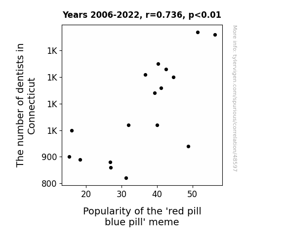 This means 54.1% of the change in the one variable (i.e., Popularity of the 'red pill blue pill' meme) is predictable based on the change in the other (i.e., The number of dentists in Connecticut) over the 17 years from 2006 through 2022.