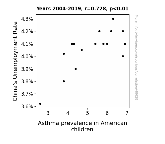 This means 53% of the change in the one variable (i.e., Asthma prevalence in American children) is predictable based on the change in the other (i.e., China's Unemployment Rate) over the 16 years from 2004 through 2019.