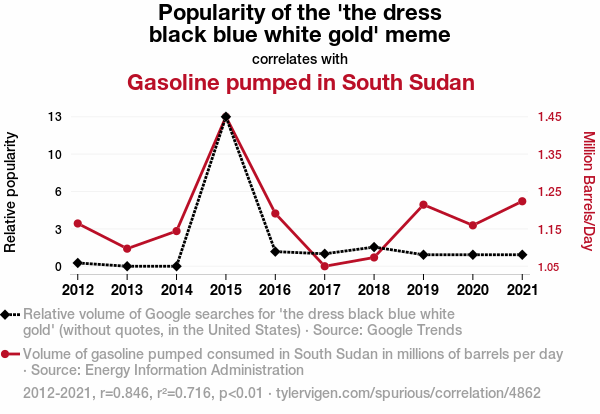 This means 71.6% of the change in the one variable (i.e., Gasoline pumped in South Sudan) is predictable based on the change in the other (i.e., Popularity of the 'the dress black blue white gold' meme) over the 10 years from 2012 through 2021.