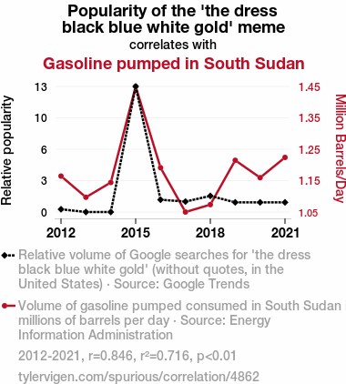"Dress black blue white gold" phenomenon, meme influence, gasoline consumption, South Sudan, correlation analysis, Google Trends data, Energy Information Administration, internet culture, real-world trends, color perception, correlation coefficient, statistical significance