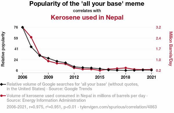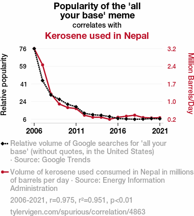 This means 95.1% of the change in the one variable (i.e., Kerosene used in Nepal) is predictable based on the change in the other (i.e., Popularity of the 'all your base' meme) over the 16 years from 2006 through 2021.