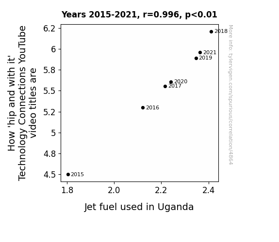 This means 99.1% of the change in the one variable (i.e., Jet fuel used in Uganda) is predictable based on the change in the other (i.e., How 'hip and with it' Technology Connections YouTube video titles are) over the 7 years from 2015 through 2021.