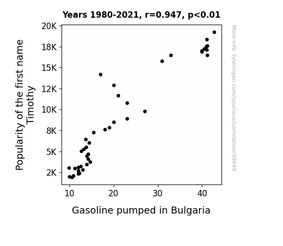 This means 89.7% of the change in the one variable (i.e., Gasoline pumped in Bulgaria) is predictable based on the change in the other (i.e., Popularity of the first name Timothy) over the 42 years from 1980 through 2021.