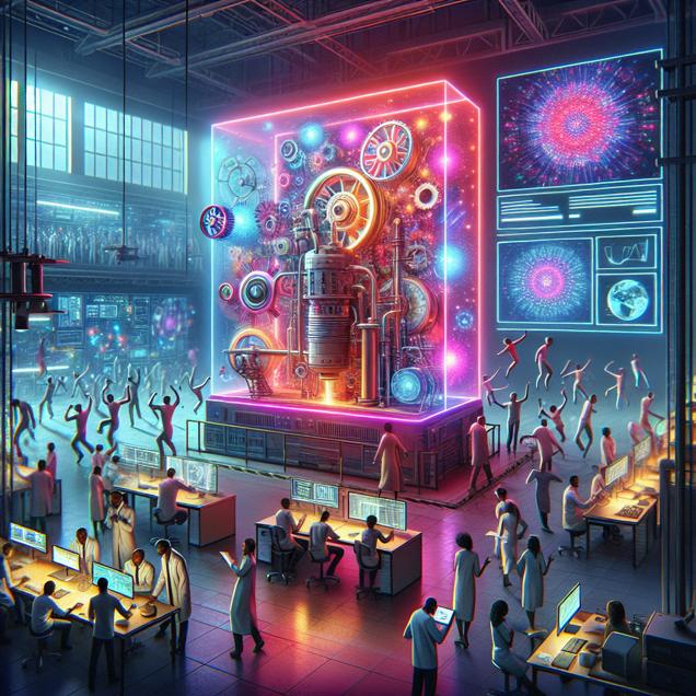 ChatGPT: Create an image of a vibrant tech lab in Uganda where engineers are working on dance-activated generators powered by jet fuel. The generators cast a colorful glow on the wall, where a screen displays 'hip and with it' YouTube video titles of Technology Connections, creating an electric and upbeat atmosphere in the room. The scene should radiate energy and innovation, with a nod to the technological advancements in a dynamic environment.
