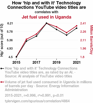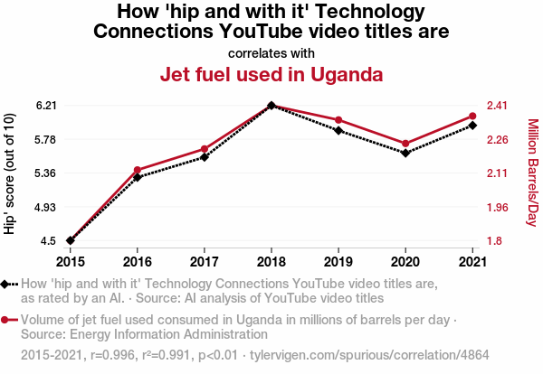 This means 99.1% of the change in the one variable (i.e., Jet fuel used in Uganda) is predictable based on the change in the other (i.e., How 'hip and with it' Technology Connections YouTube video titles are) over the 7 years from 2015 through 2021.