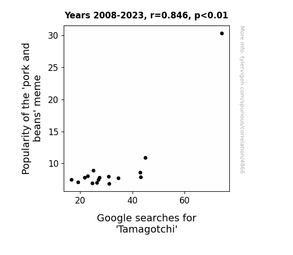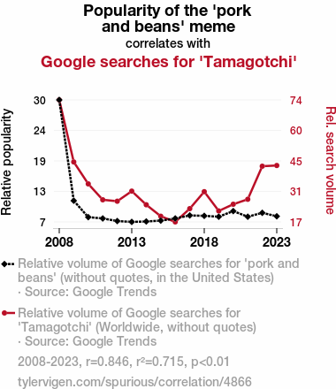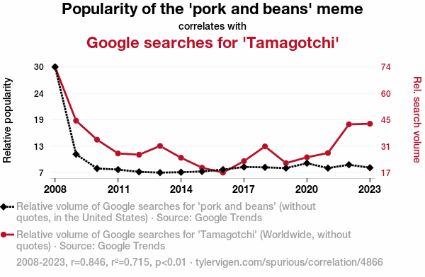 - The spurious research paper: Pigging Out on Digital Nostalgia: Exploring the Correlation Between the 'Pork and Beans' Meme and Google Searches for 'Tamagotchi'