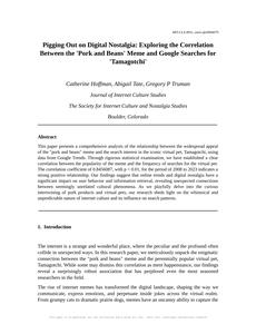 User prompt: Please provide potential search keywords for a paper titled Pigging Out on Digital Nostalgia: Exploring the Correlation Between the 'Pork and Beans' Meme and Google Searches for 'Tamagotchi' with an abstract of This paper presents a comprehensive analysis of the relationship between the widespread appeal of the "pork and beans" meme and the search interest in the iconic virtual pet, Tamagotchi, using data from Google Trends. Through rigorous statistical examination, we have established a clear correlation between the popularity of the meme and the frequency of searches for the virtual pet. The correlation coefficient of 0.8456087, with p < 0.01, for the period of 2008 to 2023 indicates a strong positive relationship. Our findings suggest that online trends and digital nostalgia have a significant impact on user behavior and information retrieval, revealing unexpected connections between seemingly unrelated cultural phenomena. As we playfully delve into the curious intertwining of pork products and virtual pets, our research sheds light on the whimsical and unpredictable nature of internet culture and its influence on search patterns.