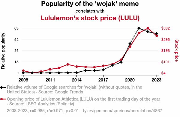 wojak meme, internet meme popularity, stock performance, Lululemon, Lululemon Athletica Inc., LULU stock price, Google Trends, LSEG Analytics, Refinitiv, correlation coefficient, statistical significance, athletic apparel industry, internet culture, financial markets, memes and money, digital humor, stock market trends