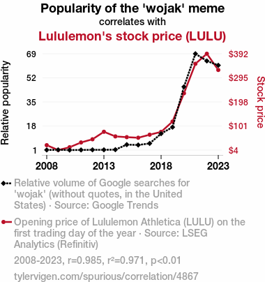 - The spurious research paper: From Wojak to Stocks: Investigating the Connection between Meme Popularity and Lululemon's Stock Price