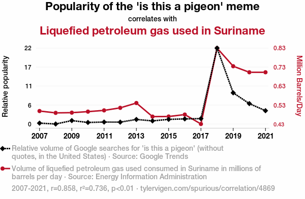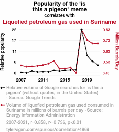 - The spurious research paper: The Lighter Side of the 'Is This a Pigeon' Meme: Exploring the Relationship with Liquefied Petroleum Gas Consumption in Suriname