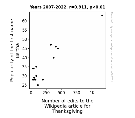 This means 83% of the change in the one variable (i.e., Number of edits to the Wikipedia article for Thanksgiving) is predictable based on the change in the other (i.e., Popularity of the first name Bertha) over the 16 years from 2007 through 2022.