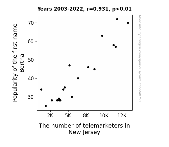 This means 86.6% of the change in the one variable (i.e., The number of telemarketers in New Jersey) is predictable based on the change in the other (i.e., Popularity of the first name Bertha) over the 20 years from 2003 through 2022.