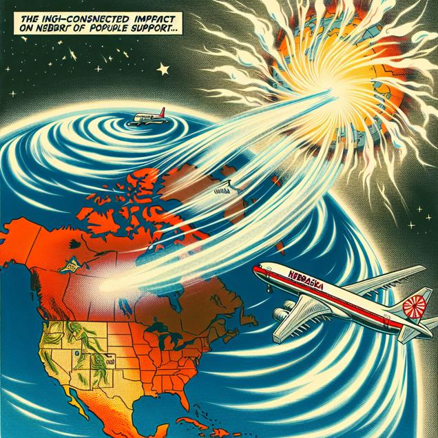 ChatGPT: Generate an illustration in a comic-book style reminiscent of the 1960s. In the scene, showcase energetically radiating from a map of Nebraska, depicting a higher density of voters supporting the Democrat presidential candidate. This invisible force lifts the atmosphere, creating swirls of wind over Guinea. Nearby, a commercial airliner is shown, using slightly more jet fuel as pilots compensate for the unforeseen atmospheric change. This visually presents the interconnected impact of political support and air travel in a simple yet dynamic way.