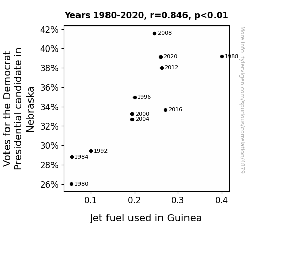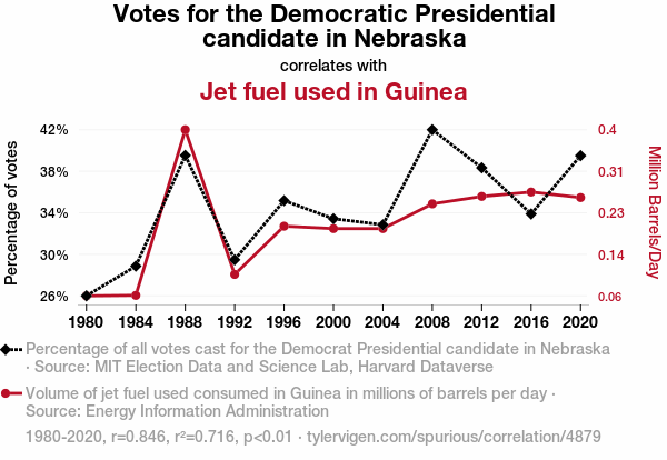 This means 71.6% of the change in the one variable (i.e., Jet fuel used in Guinea) is predictable based on the change in the other (i.e., Votes for the Democratic Presidential candidate in Nebraska) over the 11 years from 1980 through 2020.