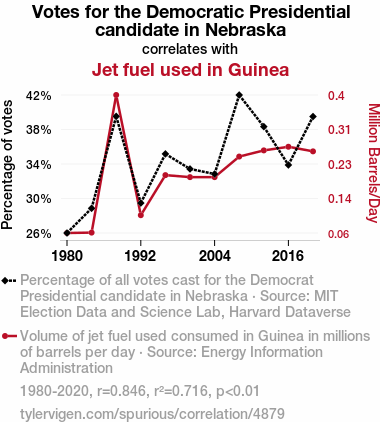 - The spurious research paper: Going Against the Flow: The Surprising Link Between Democrat Votes in Nebraska and Jet Fuel Consumption in Guinea