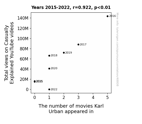 This means 85% of the change in the one variable (i.e., The number of movies Karl Urban appeared in) is predictable based on the change in the other (i.e., Total views on Casually Explained YouTube videos) over the 8 years from 2015 through 2022.