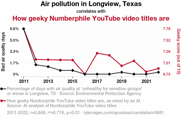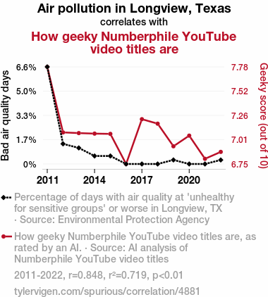 ChatGPT: In Longview, Texas, the once hazy skyline cleared up as the smog lifted, revealing a cityscape basked in clean air. Meanwhile, over at Numberphile headquarters, the video titles suddenly became filled with puns and mathematical quirkiness, with a noticeable reduction in nerdiness. The correlation between the decrease in air pollution and the increase in quirky video titles was clear as day, making Longview a prime number place to live.