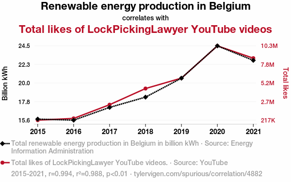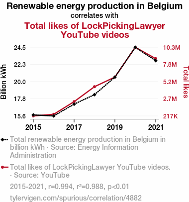 A linear line chart with years as the X-axis and two variables on the Y-axis. The first variable is Renewable energy production in Belgium and the second variable is Total likes of LockPickingLawyer YouTube videos.  The chart goes from 2015 to 2021, and the two variables track closely in value over that time. Small Image