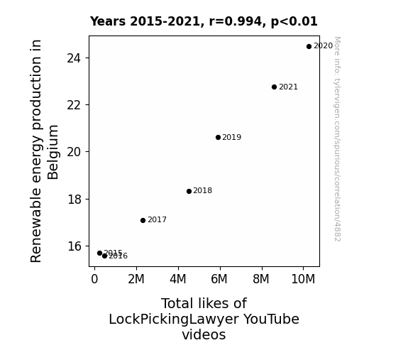 This means 98.8% of the change in the one variable (i.e., Total likes of LockPickingLawyer YouTube videos) is predictable based on the change in the other (i.e., Renewable energy production in Belgium) over the 7 years from 2015 through 2021.