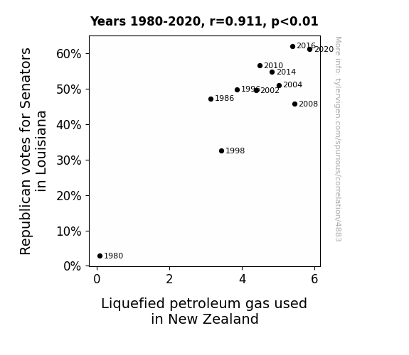 This means 83% of the change in the one variable (i.e., Liquefied petroleum gas used in New Zealand) is predictable based on the change in the other (i.e., Votes for Republican Senators in Louisiana) over the 11 years from 1980 through 2020.