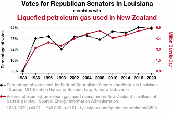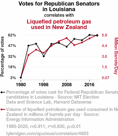 - The spurious research paper: The Republican Gas Pass: Assessing the Correlation between GOP Votes in Louisiana and LPG Usage in New Zealand