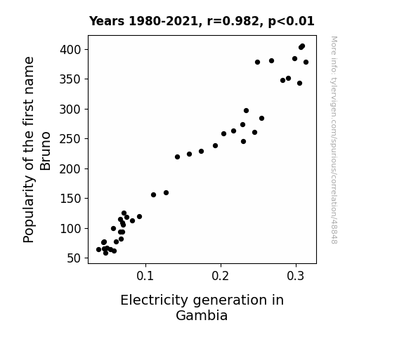 This means 96.5% of the change in the one variable (i.e., Electricity generation in Gambia) is predictable based on the change in the other (i.e., Popularity of the first name Bruno) over the 42 years from 1980 through 2021.