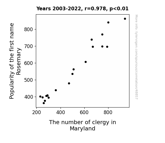 This means 95.6% of the change in the one variable (i.e., The number of clergy in Maryland) is predictable based on the change in the other (i.e., Popularity of the first name Rosemary) over the 20 years from 2003 through 2022.